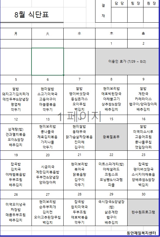 8월 식단표입니다.