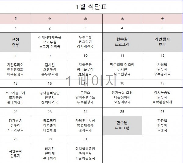 1월 식단표입니다.